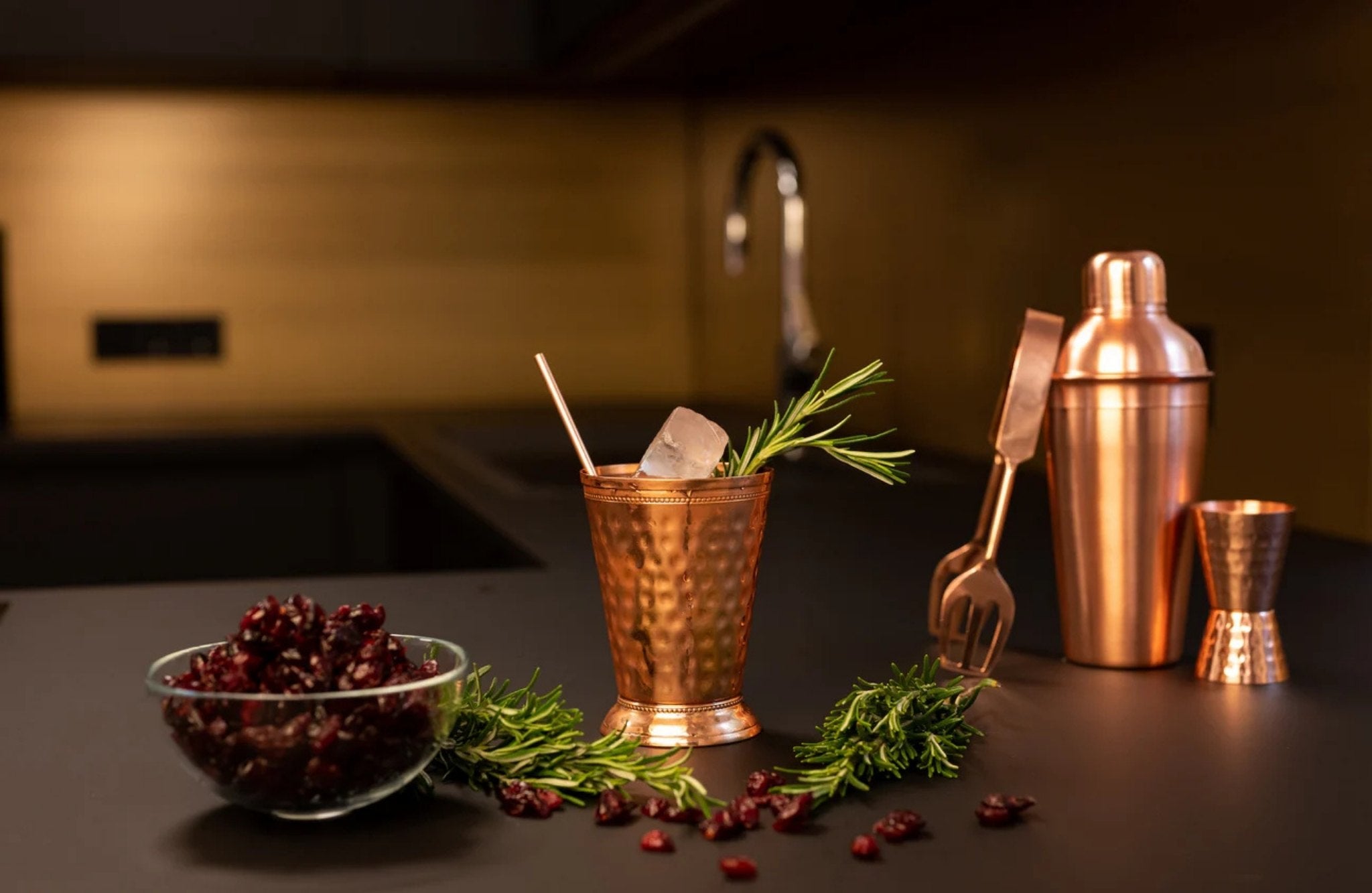 Pièces en cuivre massif martelées à la main, conçues pour être exposées autant que utilisées. Leur densité, leur fraîcheur polaire et leur présence en main affirment immédiatement la qualité du geste.