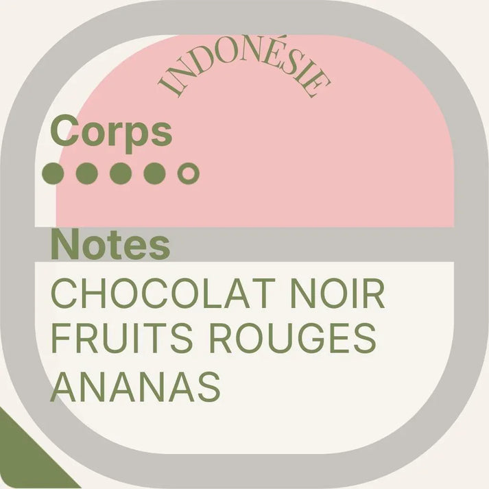 Ce café indonésien partage une base aromatique gourmande de chocolat noir, fruits rouges et ananas tout comme les grains de Tanzanie mais se distingue par un plus corsé et enveloppant. La tasse est dense, profonde, marquée par des notes terreuses et épicées de cÚdre, clou de girofle.
